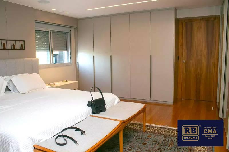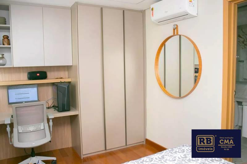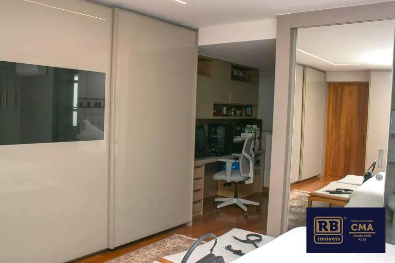 1 Quarto amplo com piso em tábua corrida, teto rebaixado e iluminação planejada, sendo a suíte com closet, escritório, rouparia, marcenaria da Cinex, janelas com persianas automatizadas e box em blindex.