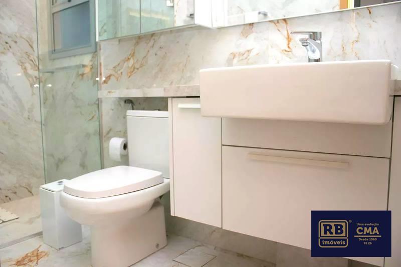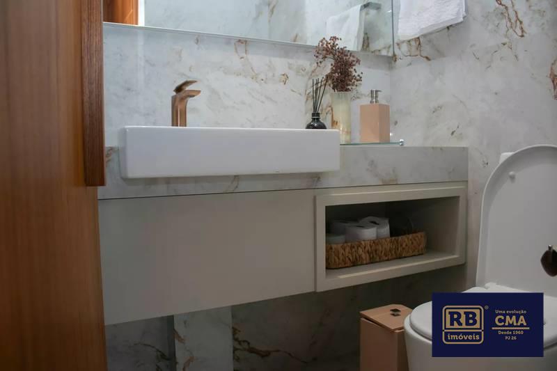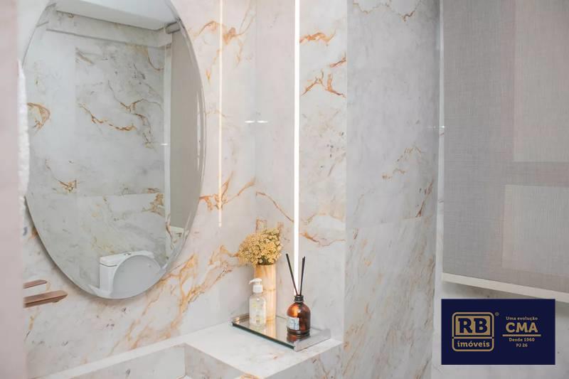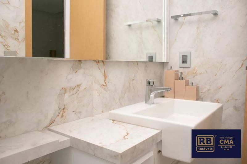 Lavabo com espelho, bancada e piso em porcelanato italiano