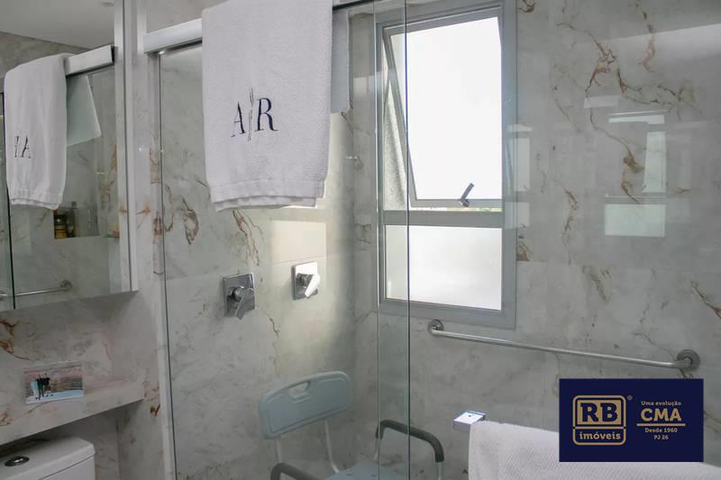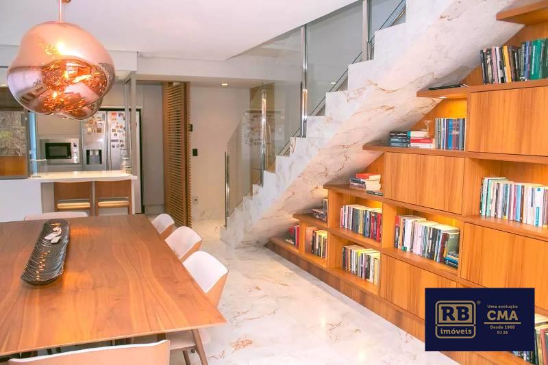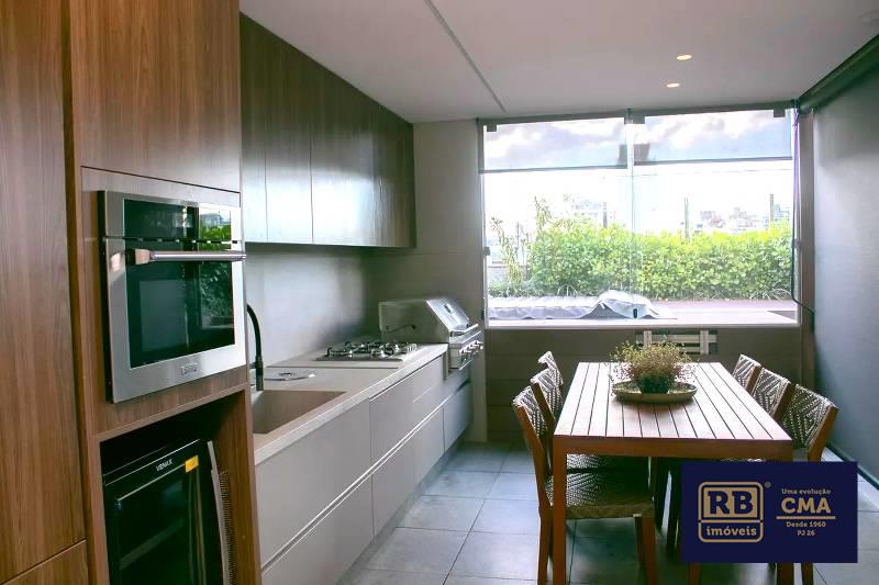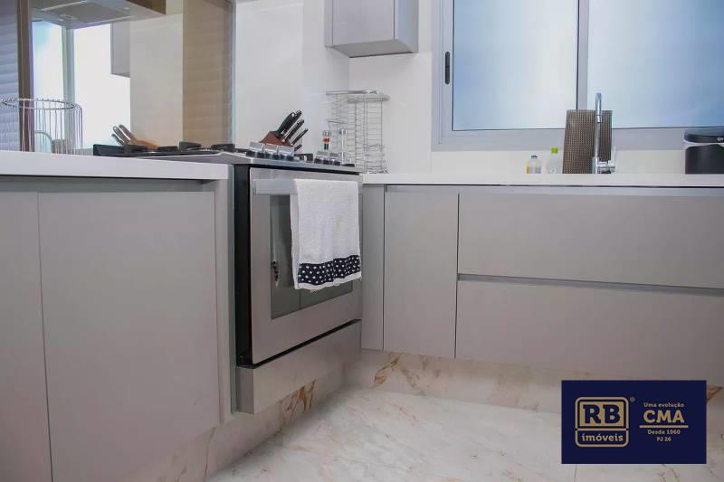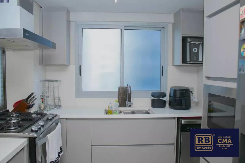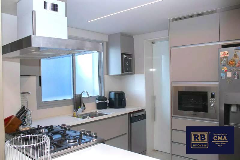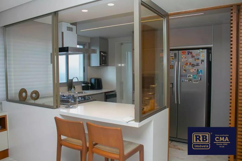 Cozinha ampla com bancada americana, passa-prato e marcenaria da Cinex, persianas automatizadas e piso em porcelanato italiano.